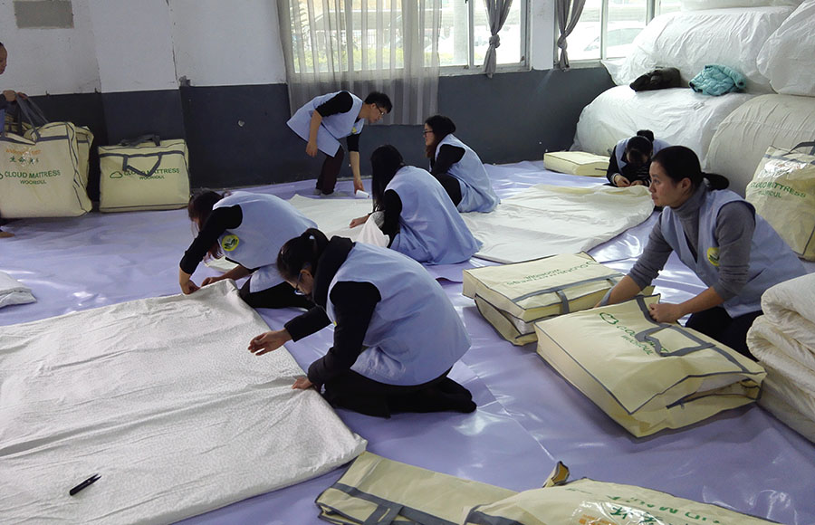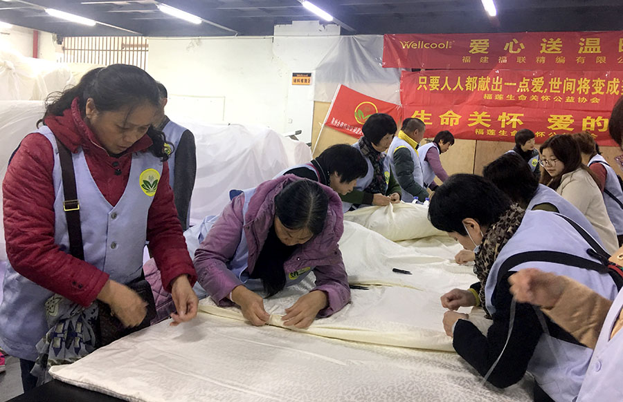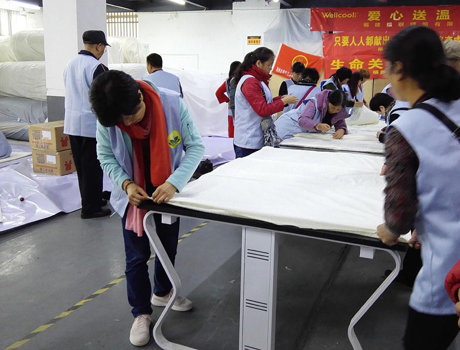 “暖冬暖心”愛心捐贈活動現(xiàn)場暖意融融,如火如茶的開展著,活動現(xiàn)場上,我司職工和協(xié)會志愿者有的包裝,有的整理,有的縫合床墊......,