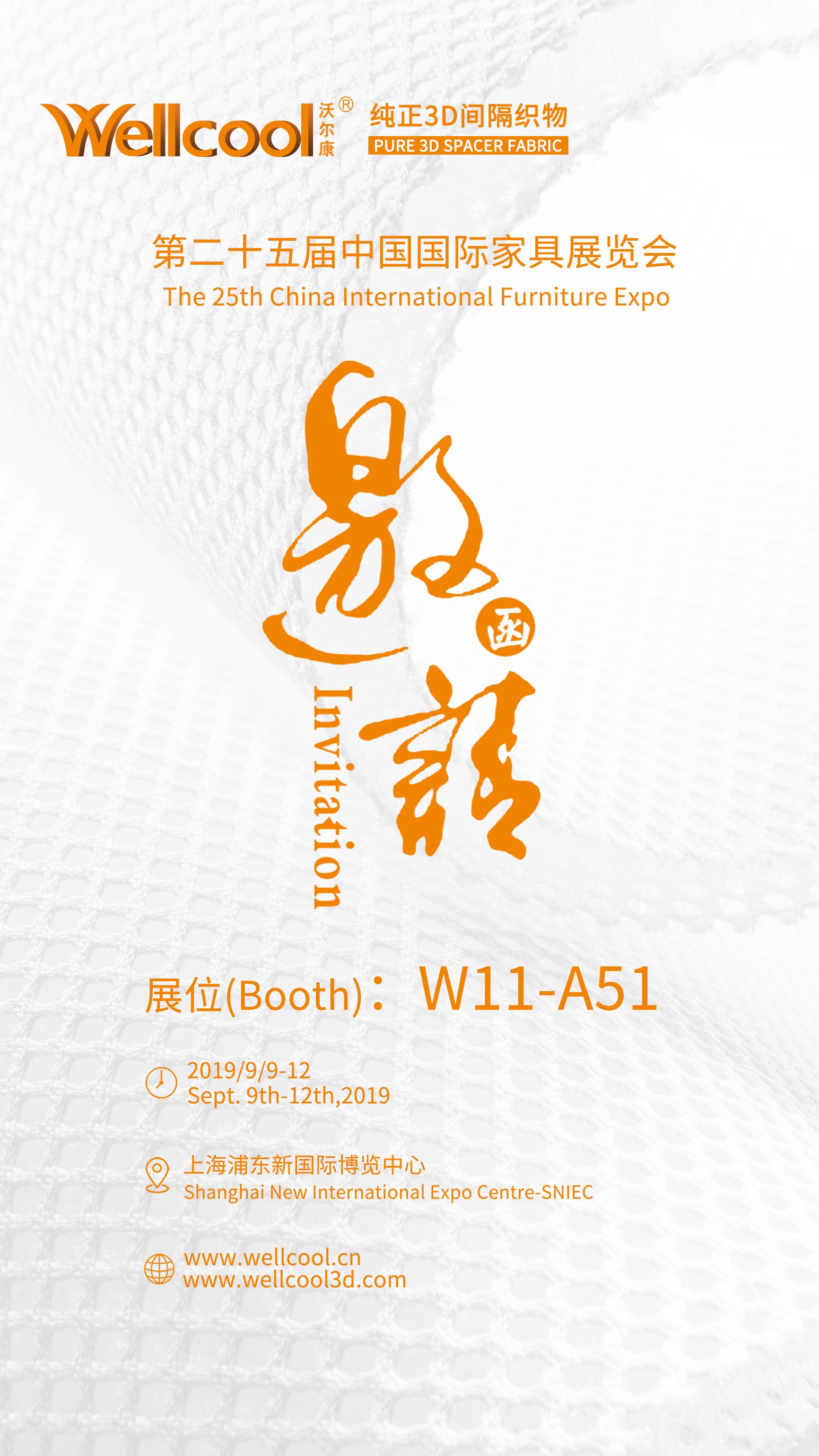 您好,我們誠摯邀請您參加2019年9月9日至12日在上海浦東新國際博覽中心舉行的第二十五屆中國國際家具展覽會。屆時將有眾多紡織同仁共聚上海。泉州沃爾康墊業(yè)科技有限公司在W11號展館A區(qū)51號恭迎您的蒞臨指導(dǎo)